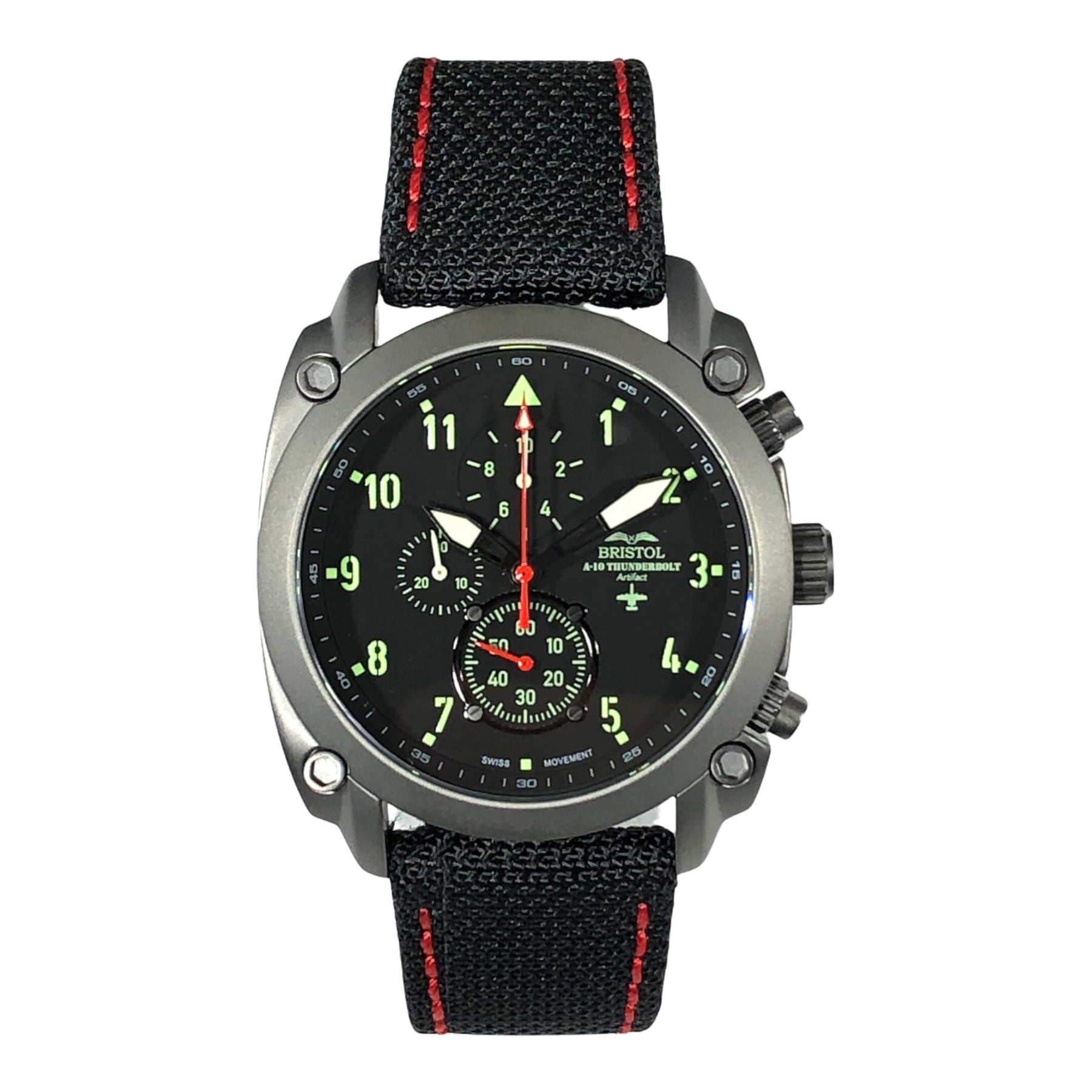 The A-10 Thunderbolt is the most iconic ground attack aircraft of modern times. Feared by enemies and beloved by its pilots and the soldiers on the ground it supports. We have designed and precision machined a rugged stainless steel case worthy of displaying an original artifact from an A-10 Thunderbolt II airframe. The movement is a precision Swiss made chronograph and the Super Luminova dial is protected by a scratch-resistant sapphire crystal. This design is limited to 1972 units in honor of the year of the A-10's first flight.