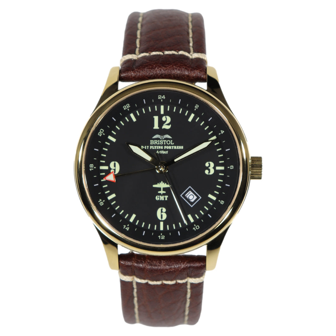 Our Model BW17D is a tribute to the iconic Boeing B-17 Flying Fortress. This classic aviator design uses a precise and reliable Swiss quartz movement with a GMT function. The Super Luminova dial is protected by a scratch-resistant sapphire crystal. The case back displays original airframe material from Boeing B-17 Flying Fortress SN#41-2595. This particular aircraft is a rare B-17E, was named "Desert Rat" and "Tangerine", and entered service February 14, 1942. It is currently undergoing an extensive restoration and will once again return to the air. The rugged B-17 flew for the Allied Air Forces in every theater of WWII and beyond. It is certainly one of the most iconic heavy bombers of WWII. Of the 12,731 B-17's built 46 complete airframes survive with fewer than 10 still flying. This model is limited to 1945 units in honor of the end of WWII.