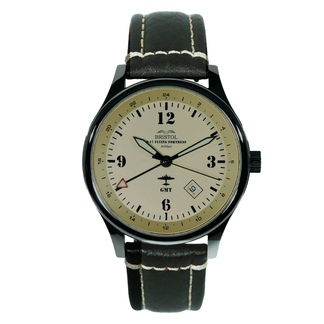 Our Model BW17C is a tribute to the iconic Boeing B-17 Flying Fortress. This classic aviator design uses a precise and reliable Swiss quartz movement with a GMT function. The Super Luminova dial is protected by a scratch-resistant sapphire crystal. The case back displays original airframe material from Boeing B-17 Flying Fortress SN#41-2595. This particular aircraft is a rare B-17E, was named "Desert Rat" and "Tangerine", and entered service February 14, 1942. It is currently undergoing an extensive restoration and will once again return to the air. The rugged B-17 flew for the Allied Air Forces in every theater of WWII and beyond. It is certainly one of the most iconic heavy bombers of WWII. Of the 12,731 B-17's built 46 complete airframes survive with fewer than 10 still flying. This model is limited to 1945 units in honor of the end of WWII.